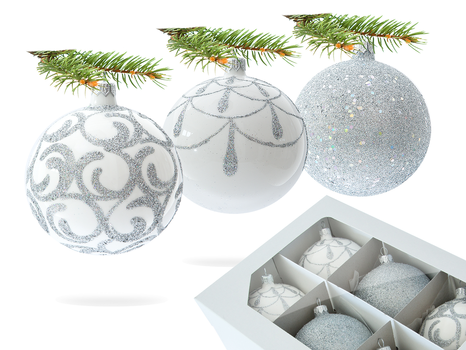 Bombki srebrne esy kula biały mix - 100 mm bombki choinkowe szklane 6 szt