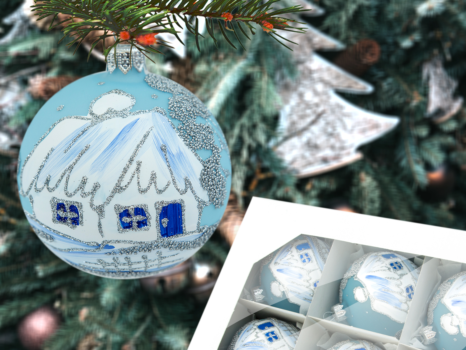 Bombki chatki na niebieskim - 80 mm bombki choinkowe szklane 6 szt