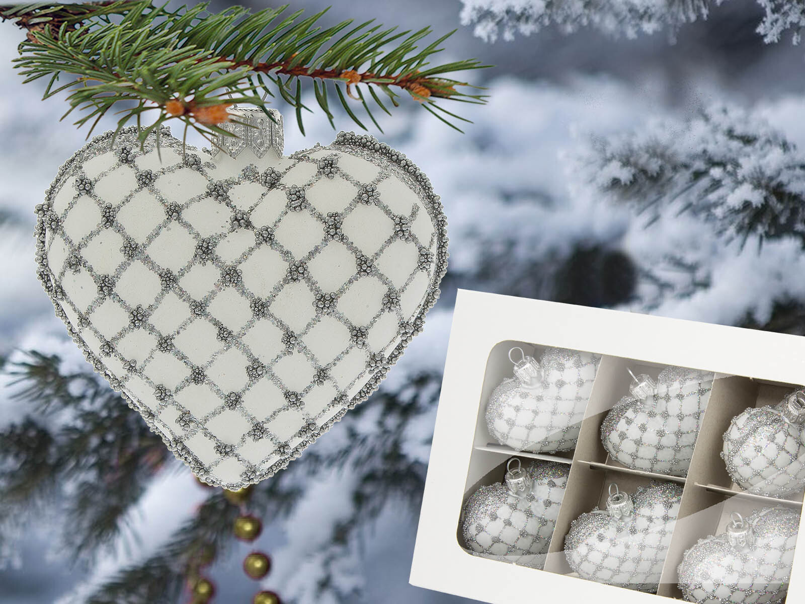 Bombki serca biało srebrne -  8 x 7 cm bombki choinkowe szklane 6 szt
