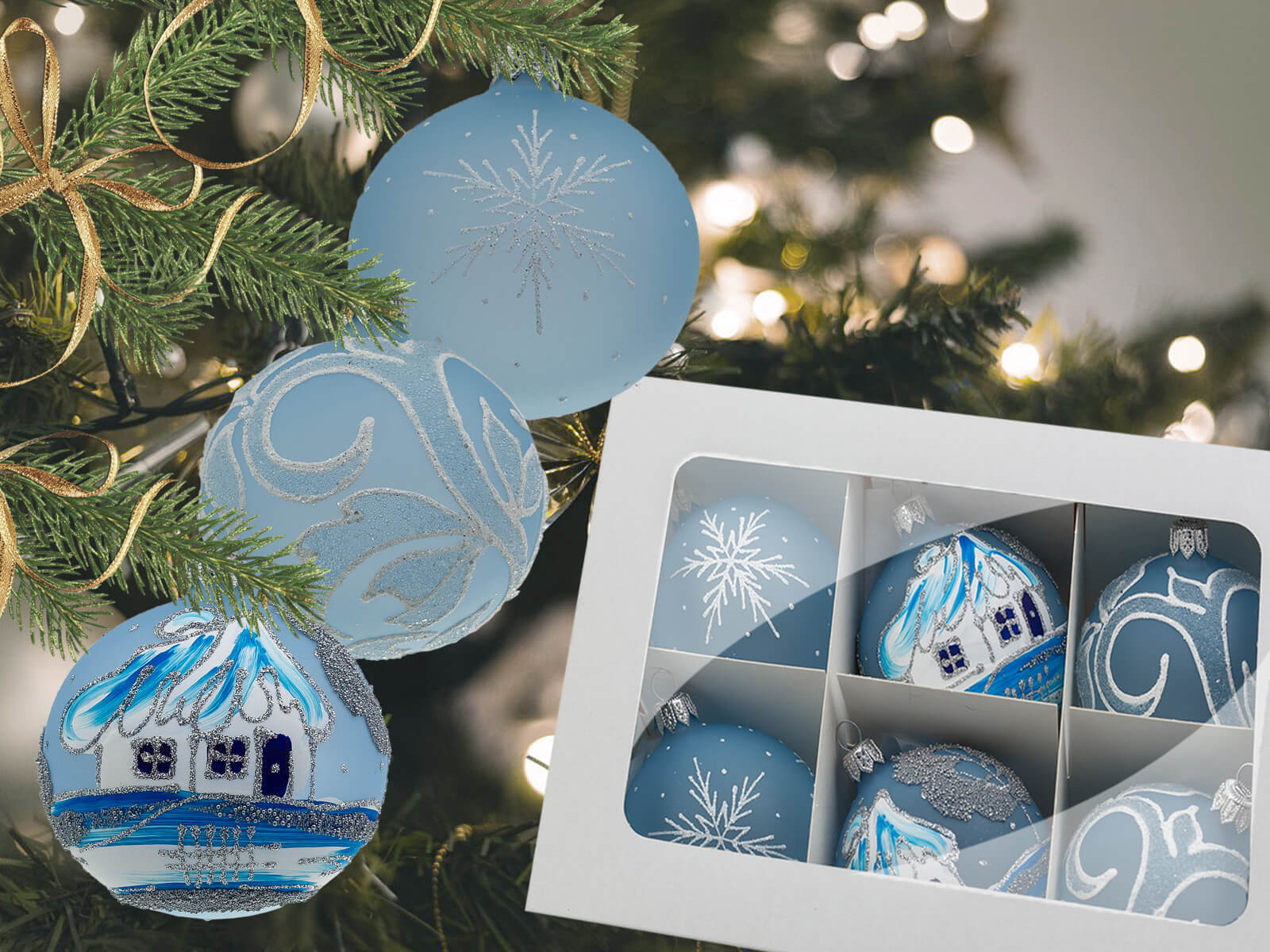 Bombki srebrne chatki listki błękit mix - 80 mm bombki choinkowe szklane 6 szt