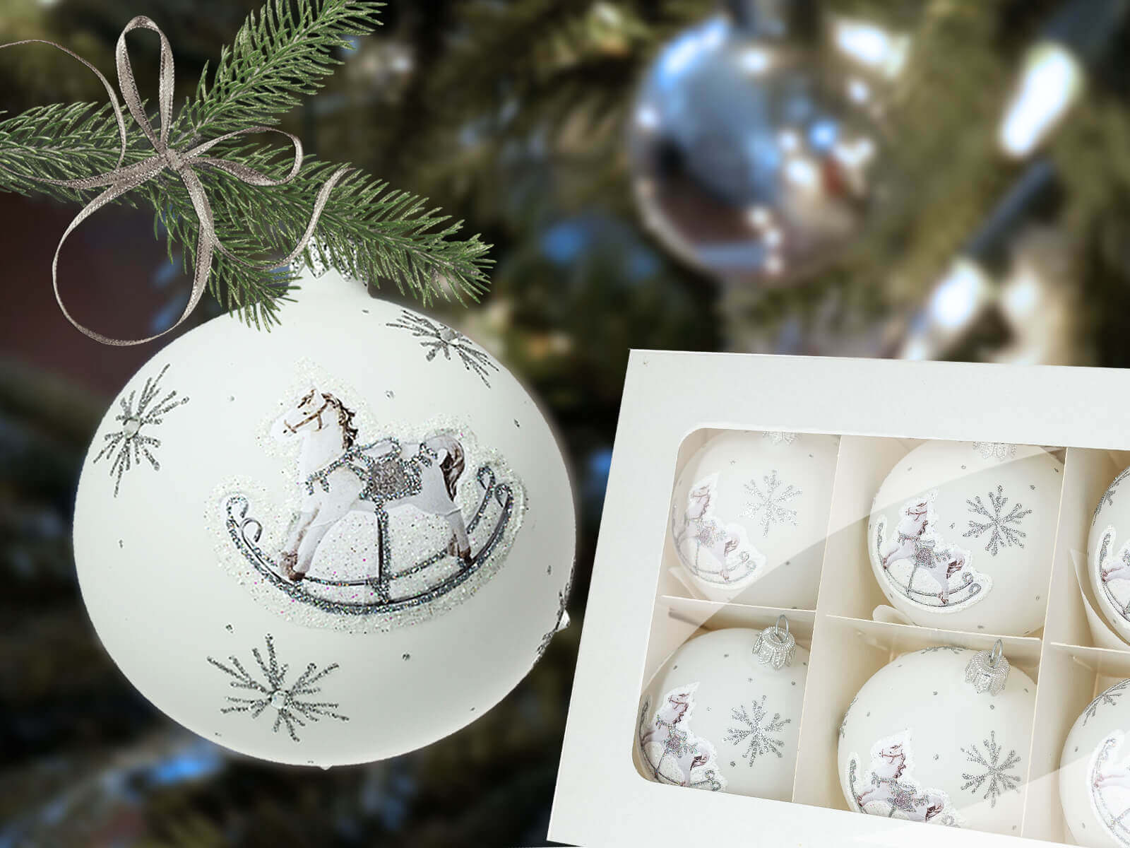 Konik na biegunach na białej kredzie -  100 mm bombki choinkowe szklane 6 szt
