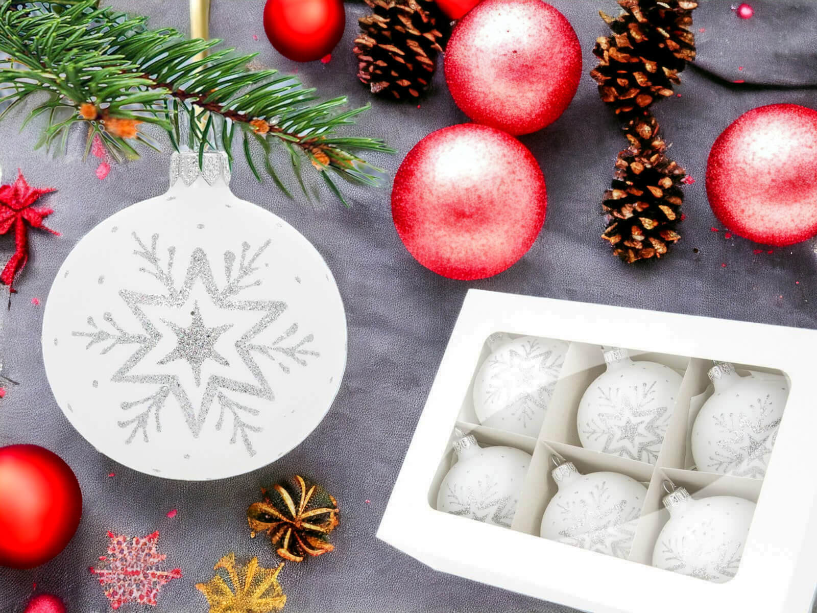 Bombki biała kreda - srebrna gwiazdka - 80 mm bombki choinkowe szklane 6 szt