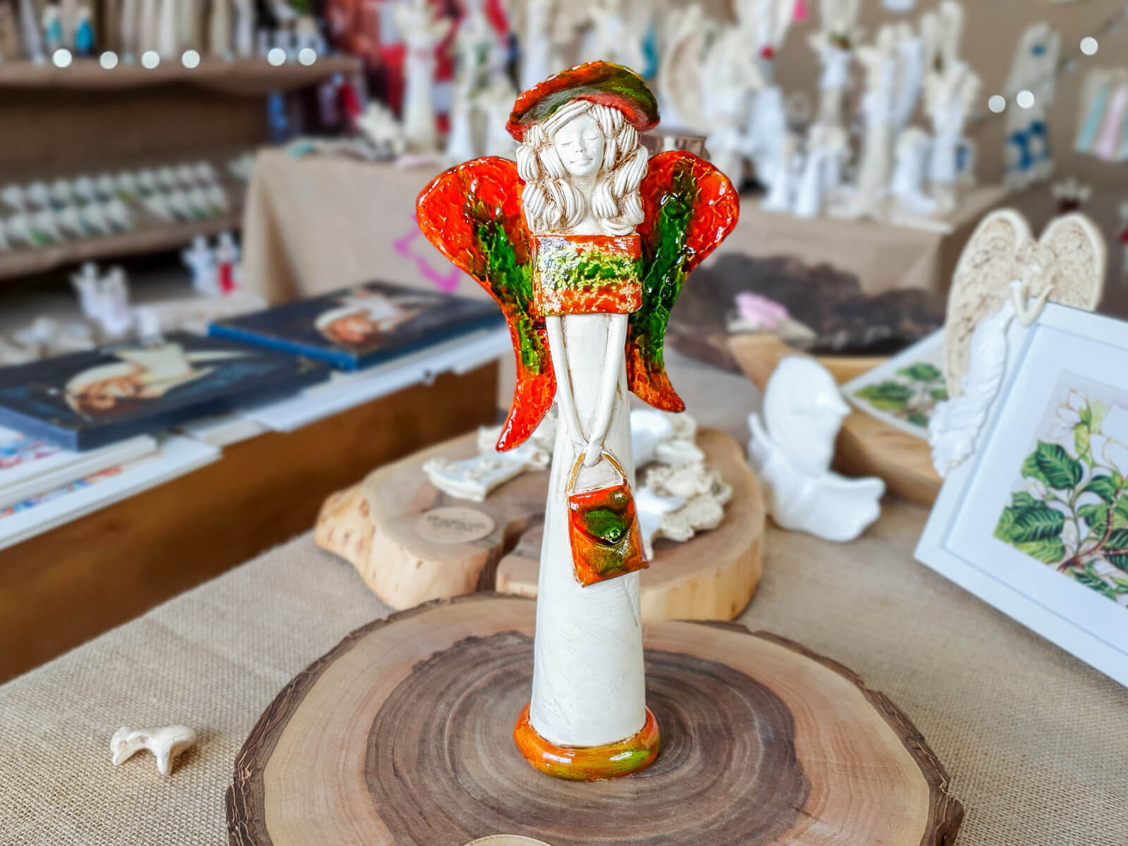 Anioł Coco - pomarańcz zieleń -  30 x 14 cm figurka dekoracyjna gipsowa