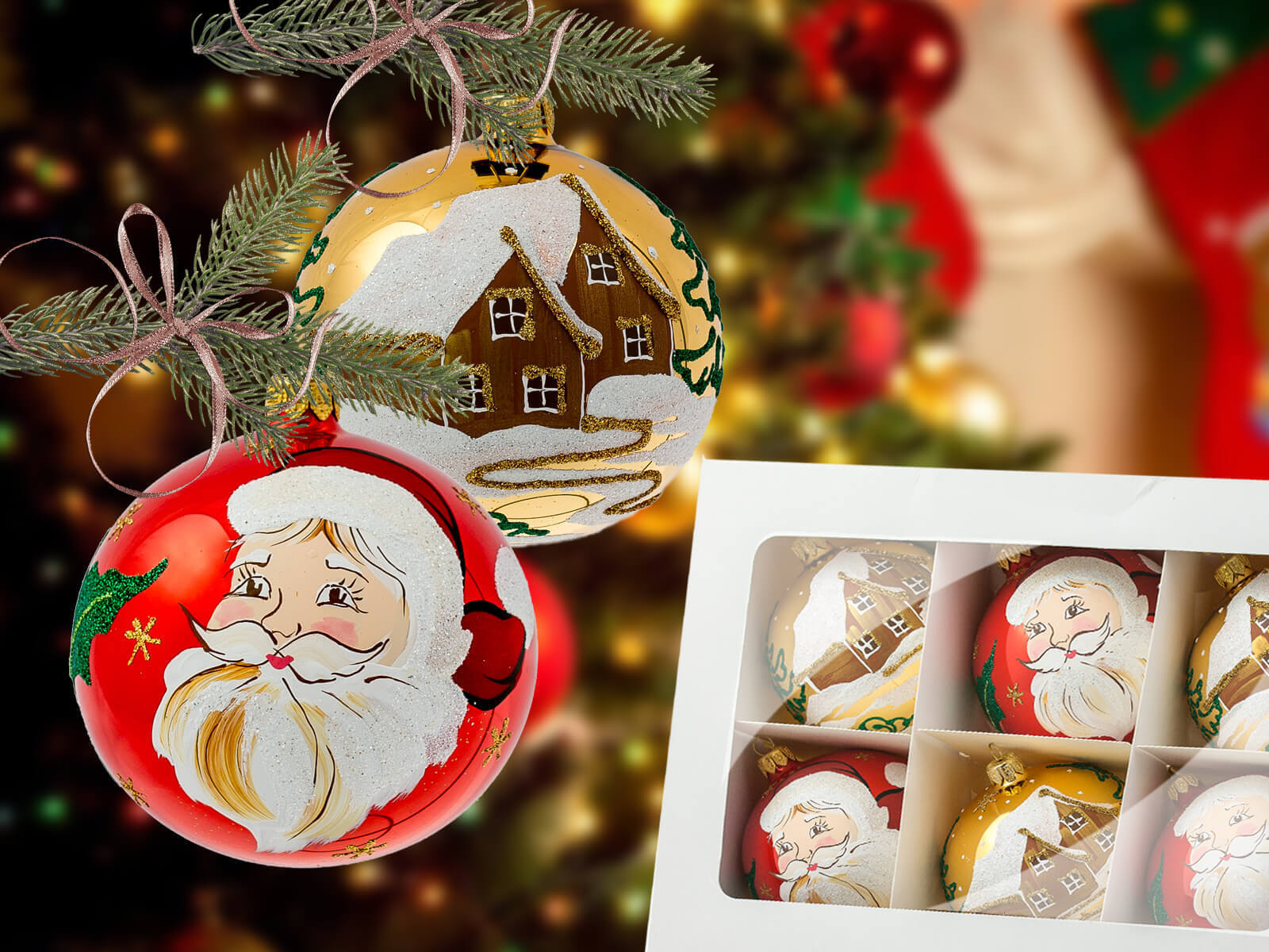 Chatki na złotym Mikołaj na czerwonym błysku - 100 mm bombki choinkowe szklane 6 szt