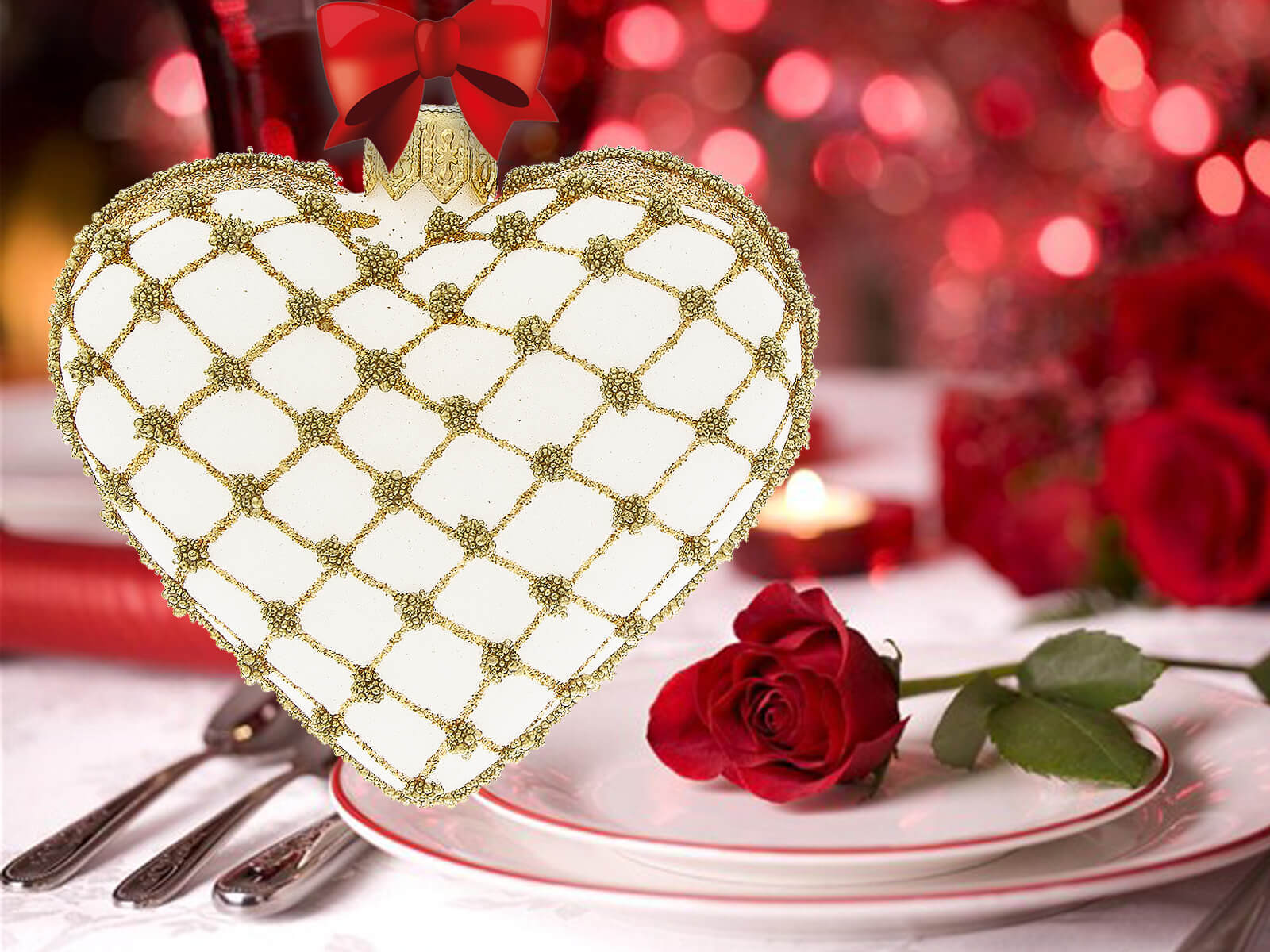 Bombka serce biało złote -  8 x 7 cm ozdoba szklana 1 szt