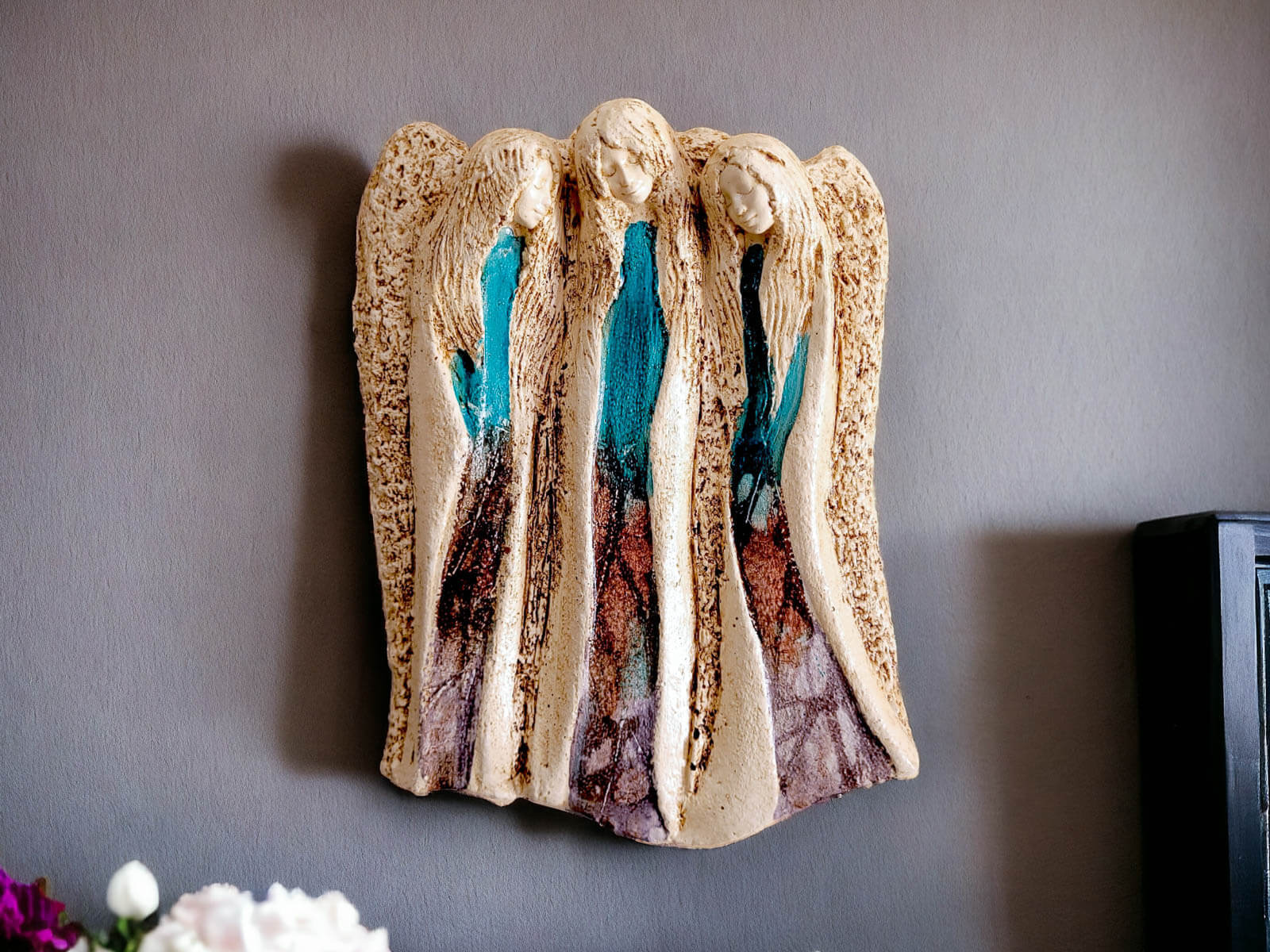 Zakochane Anioły - wiszące granatowo turkusowe -  35 x 21 cm figurka dekoracyjna gipsowa