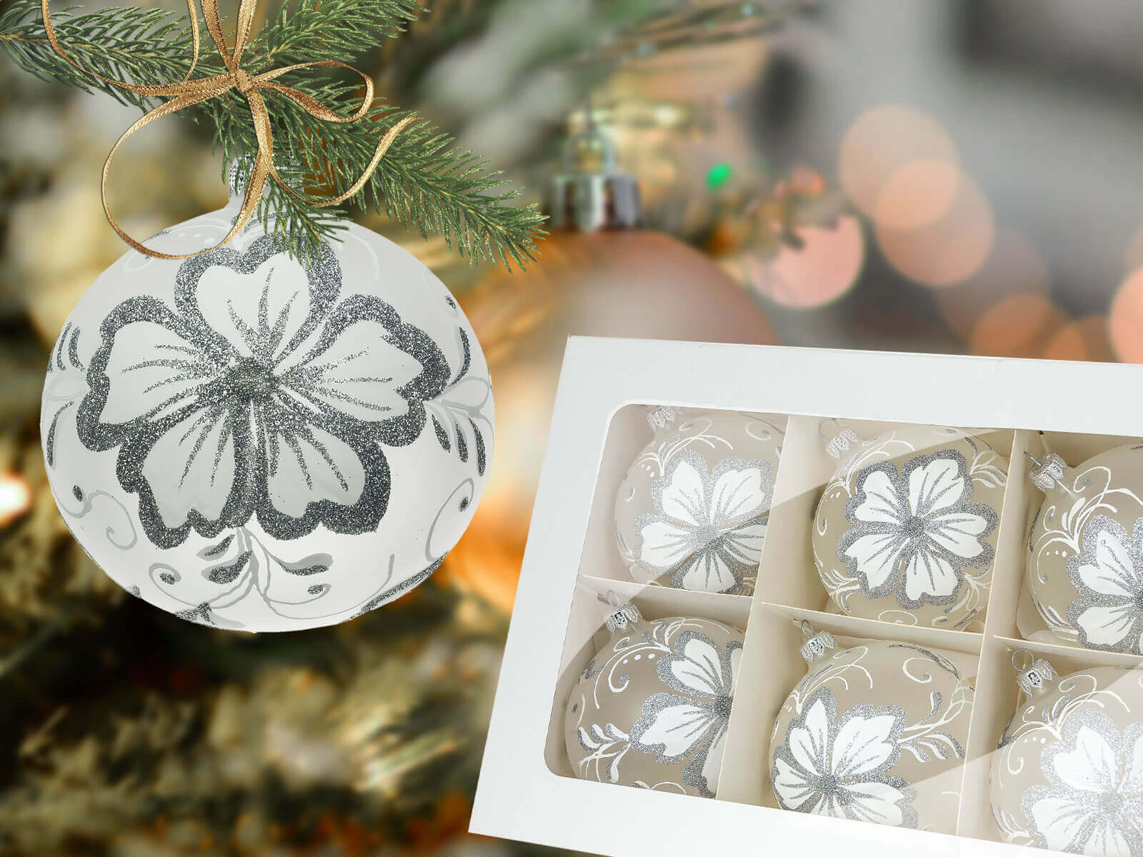Bombki białe kwiaty - 100 mm bombki choinkowe szklane 6 szt