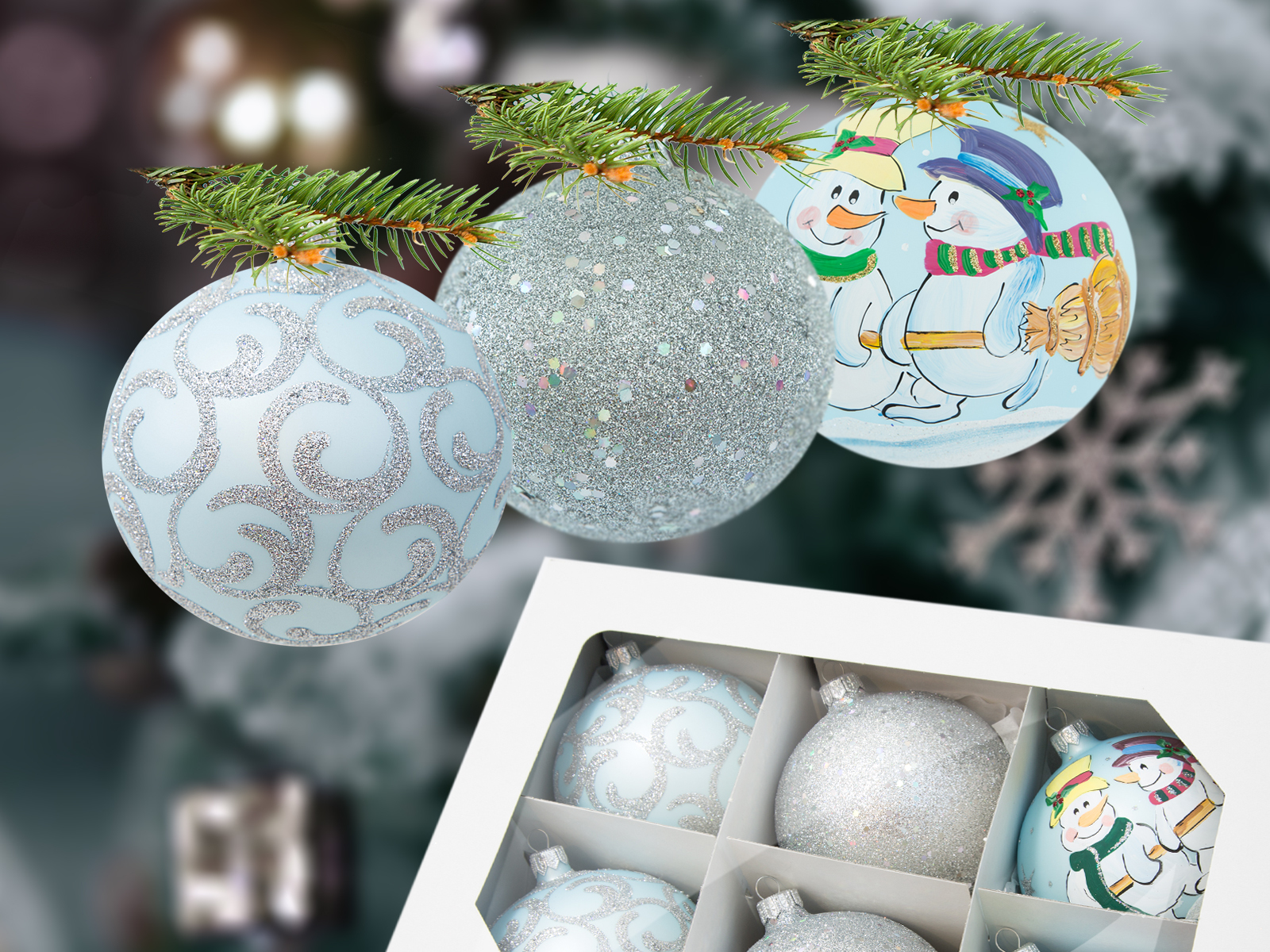 Bombki bałwanki esy błękitny mix -  100 mm bombki choinkowe szklane 6 szt