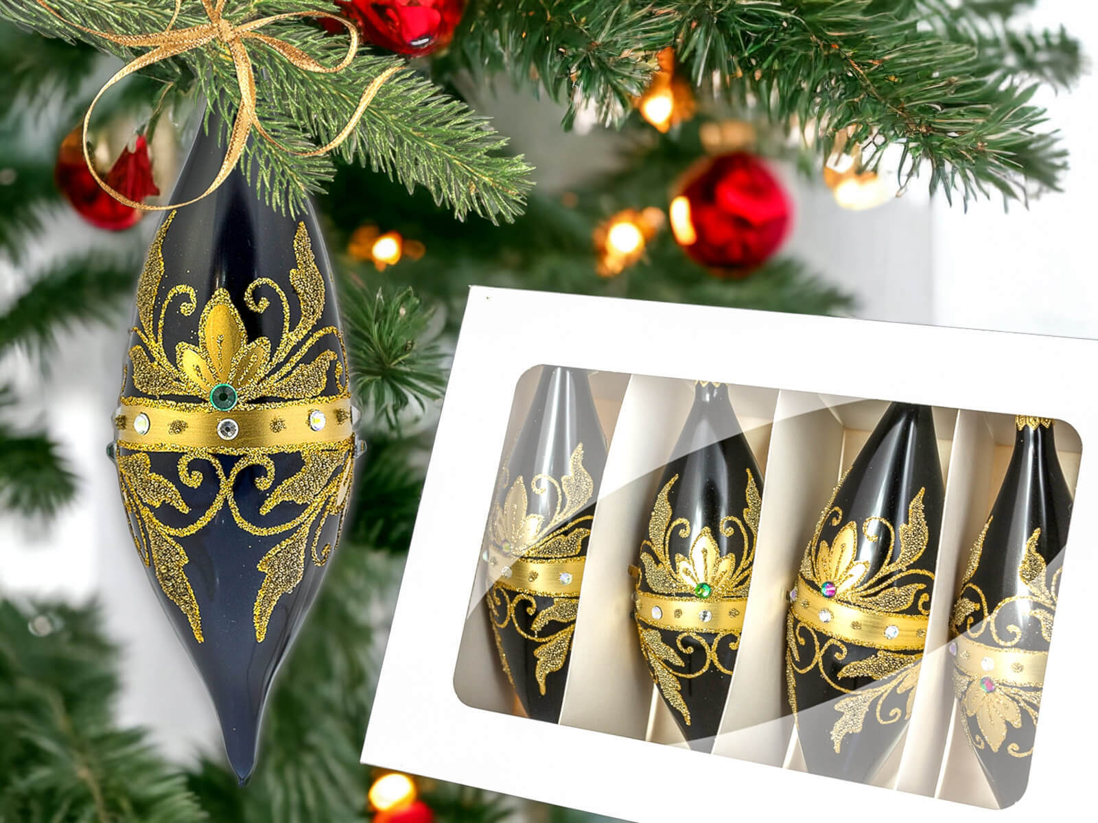 Sople Królewskie złote na czarnej porcelanie -  180 mm bombki choinkowe szklane 4 szt