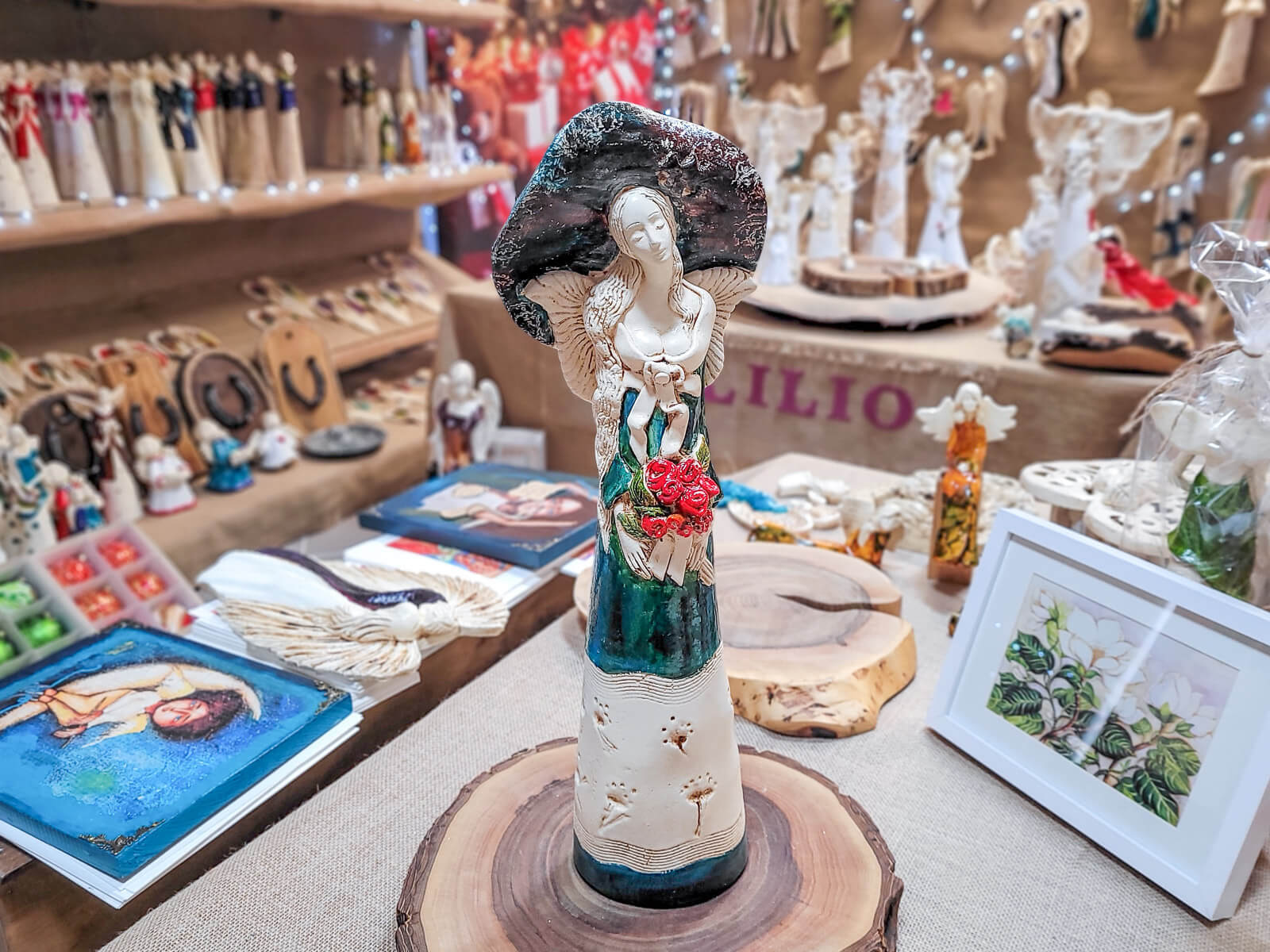 Subtelny w nietypowym kształcie pięknie się prezentuje wśród innych stojących aniołów.