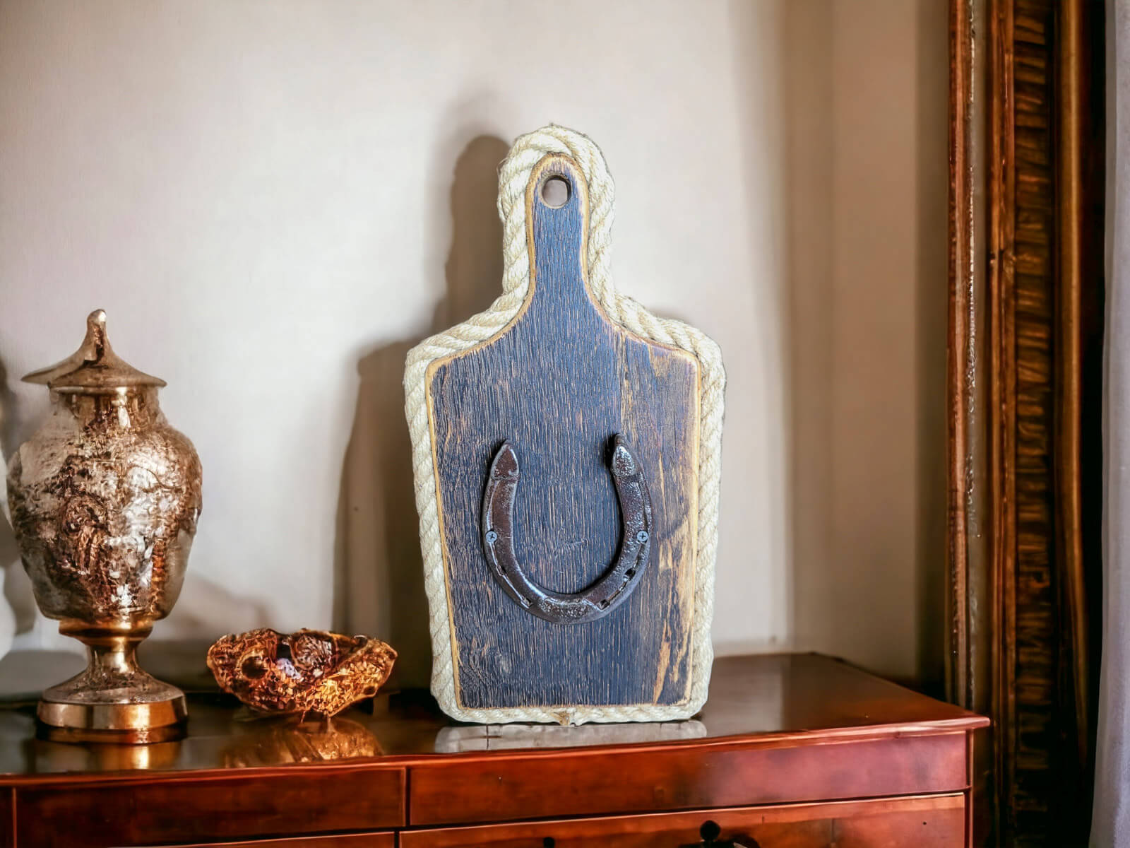 Podkowa szczęścia na desce do powieszenia - ozdoba z drewna