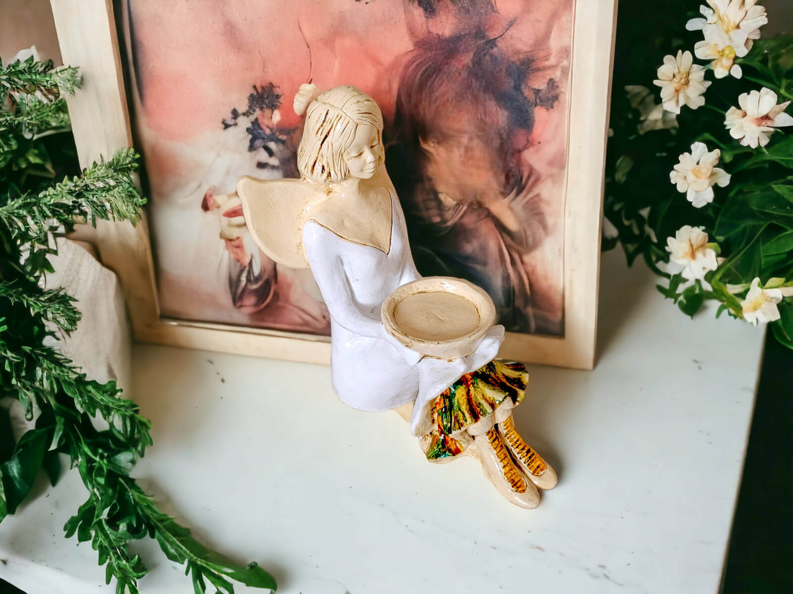 Anioł Andrea + Ramka - biały prawy - 13 x 18 cm figurka dekoracyjna gipsowa
