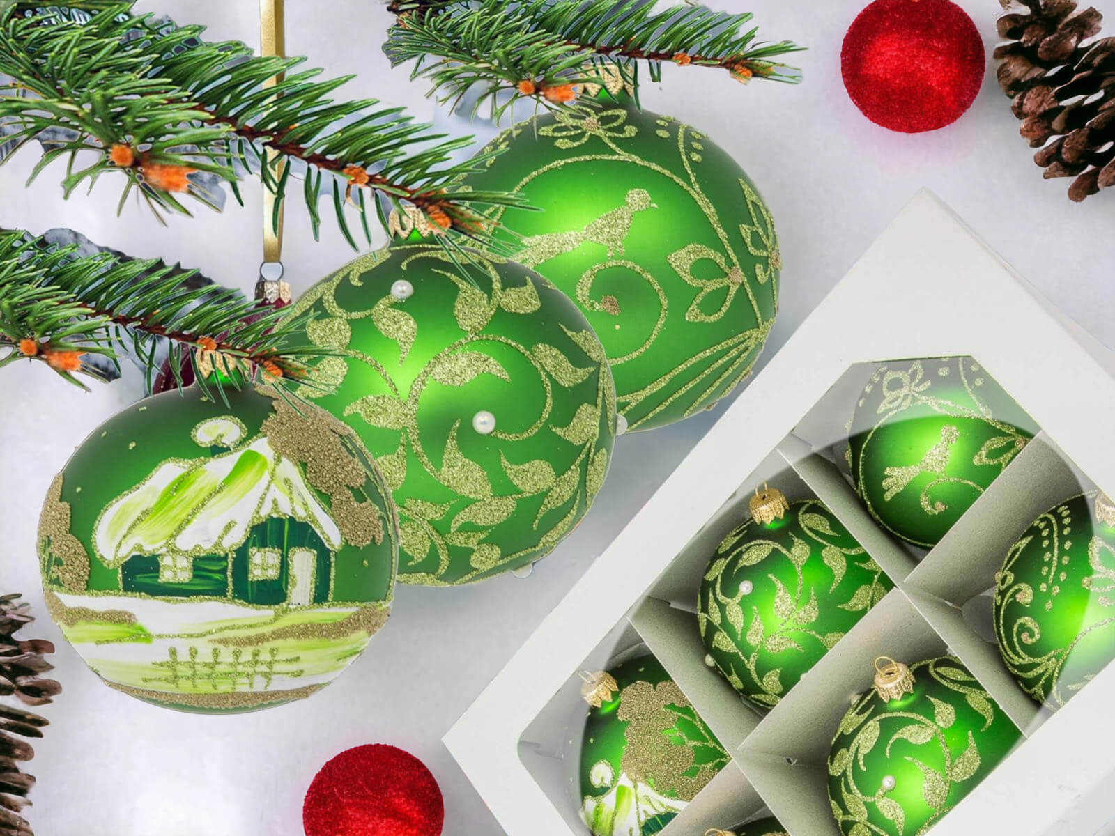 Chatki ptaszki listki zielony błysk -  100 mm bombki choinkowe szklane 6 szt