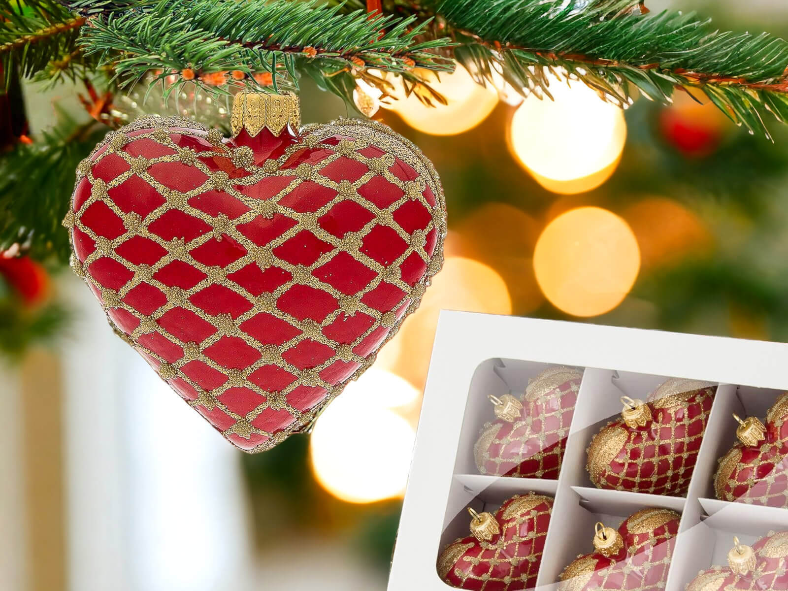 Bombki serca czerwono złote -  8 x 7 cm bombki choinkowe szklane 6 szt