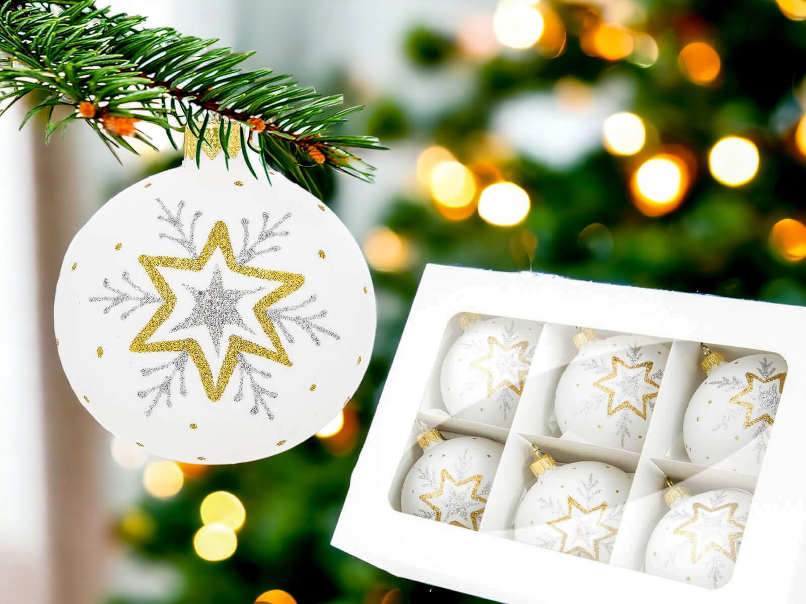 Bombki biała kreda - złota gwiazdka - 80 mm bombki choinkowe szklane 6 szt