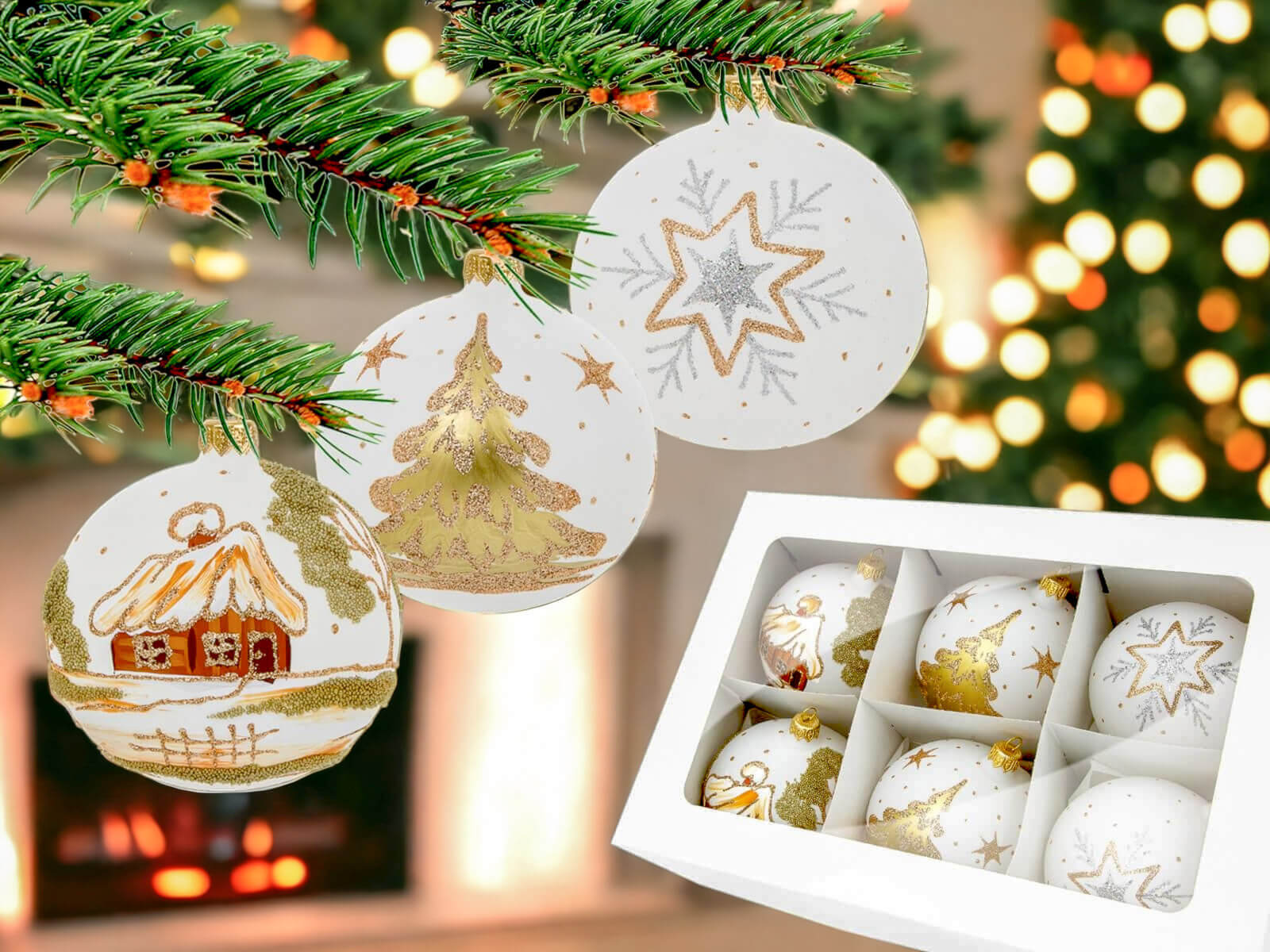 Bombki biały mix kreda - chatka choinka gwiazdka - 100 mm bombki choinkowe szklane 6 szt