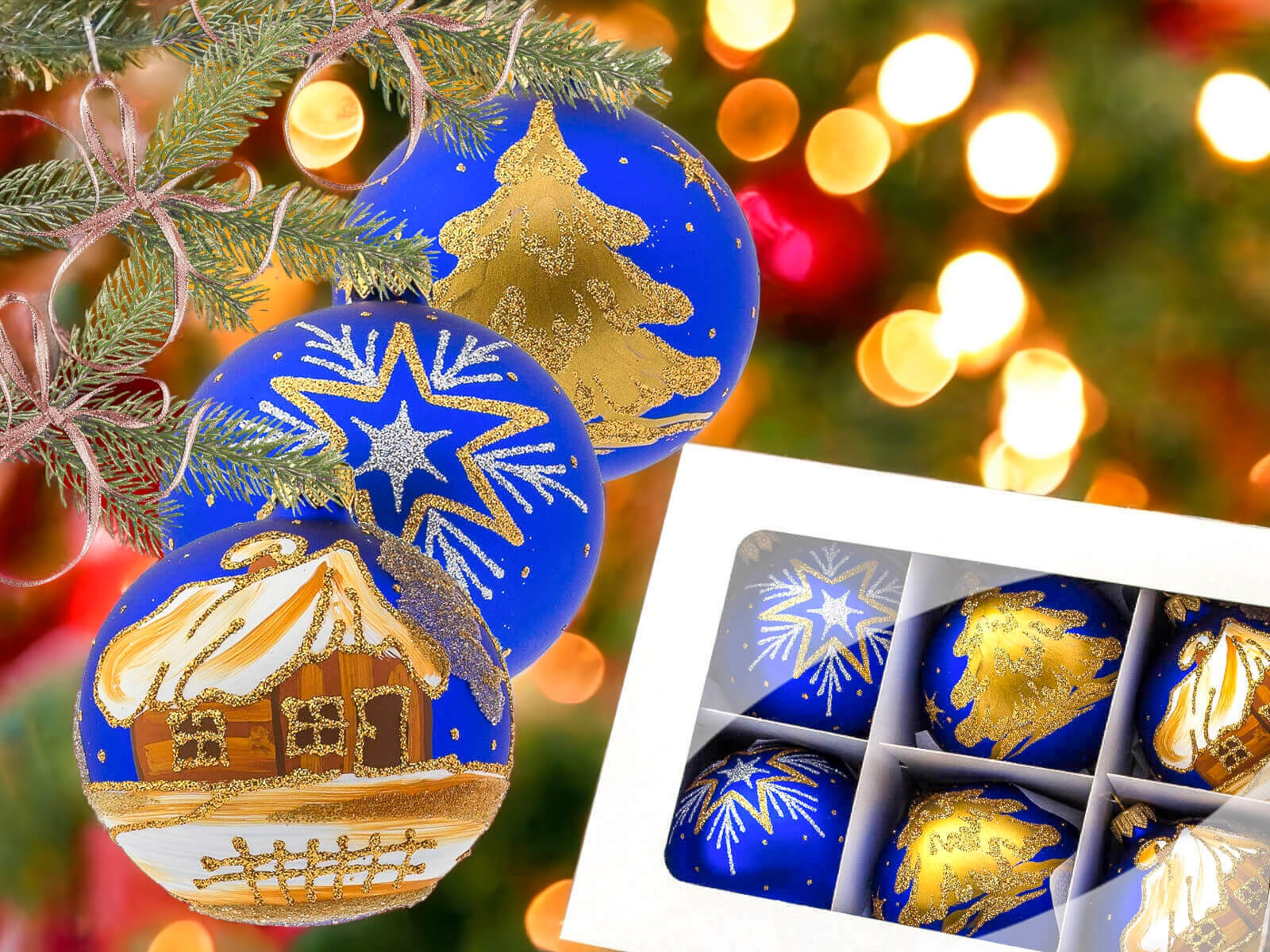 Bombki szafir złoty mix - chatka gwiazdka choinka - 80 mm bombki choinkowe szklane 6 szt