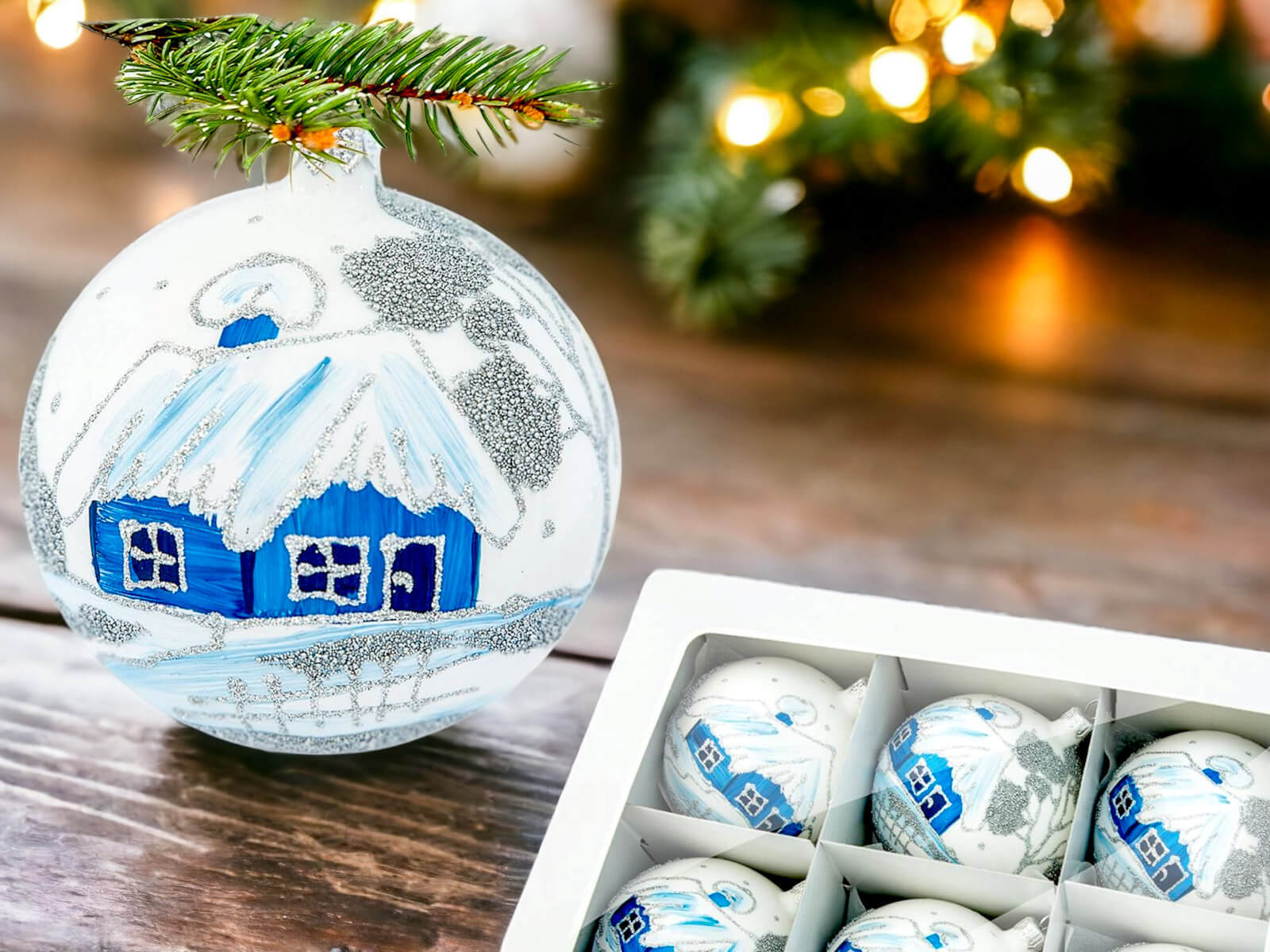 Bombki niebieskie chatki na białym - 80 mm bombka choinkowa szklana 6 szt