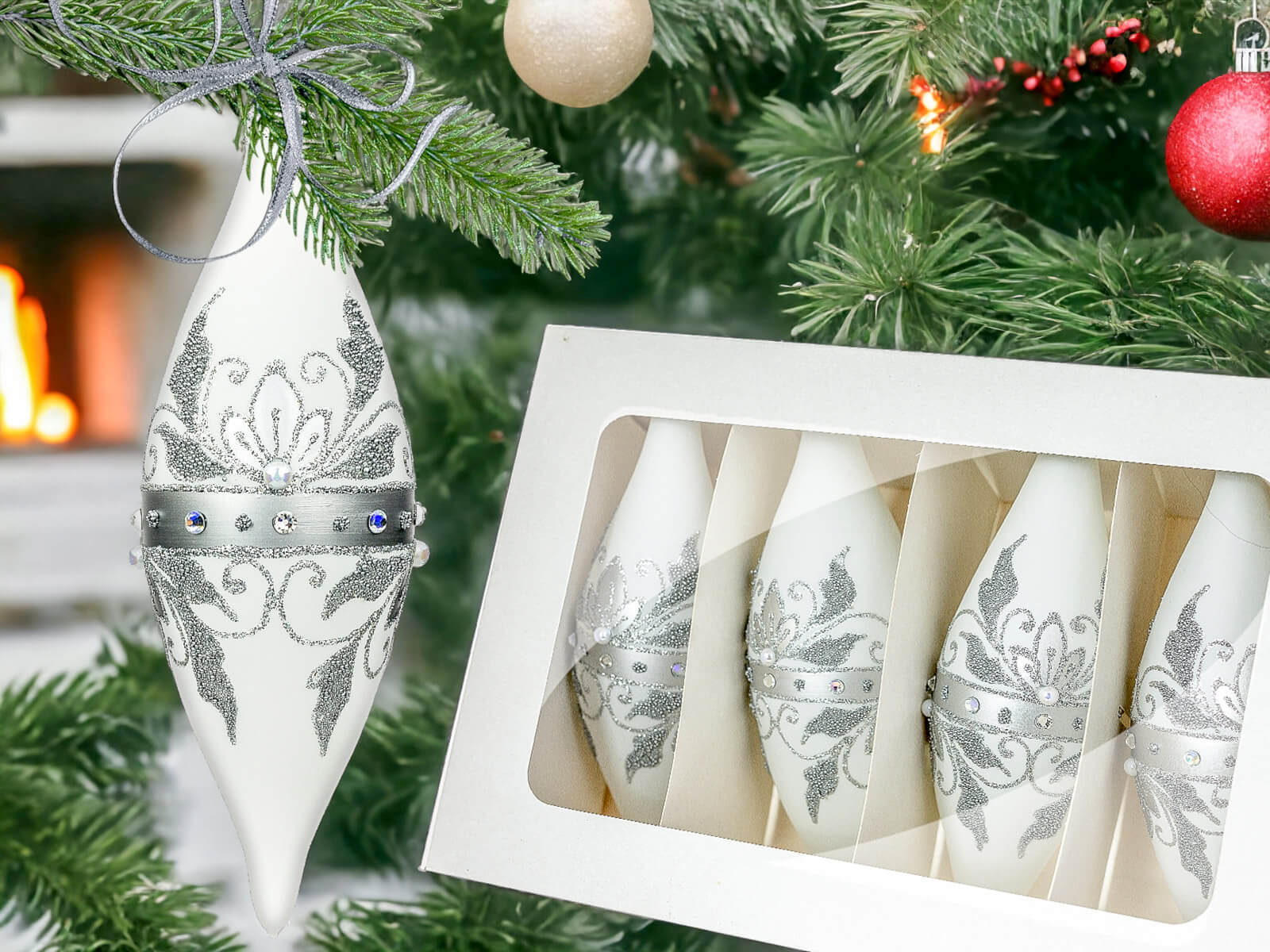 Sople Królewskie srebrne na białej kredzie -  180 mm bombki choinkowe szklane 4 szt