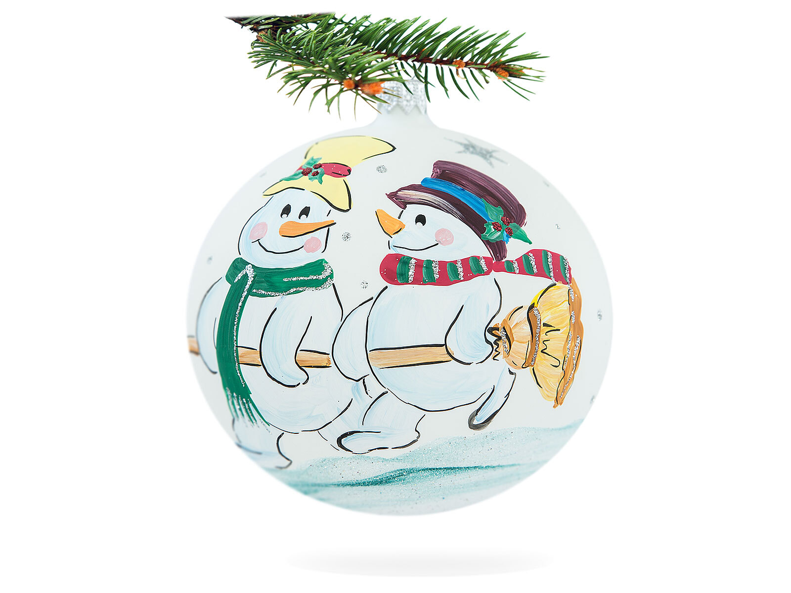 Bałwanki z miotłą na białym -  100 mm bombka choinkowa szklana 1 szt