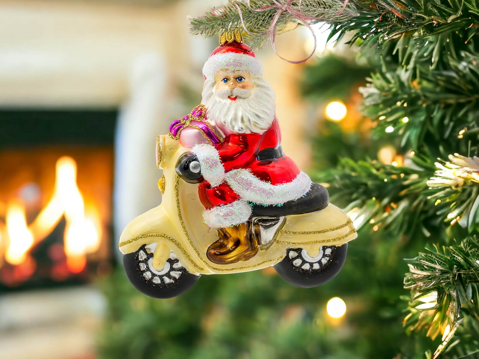Mikołaj na motocyklu - dekoracja kształtka - 12 x 11 cm bombka choinkowa szklana