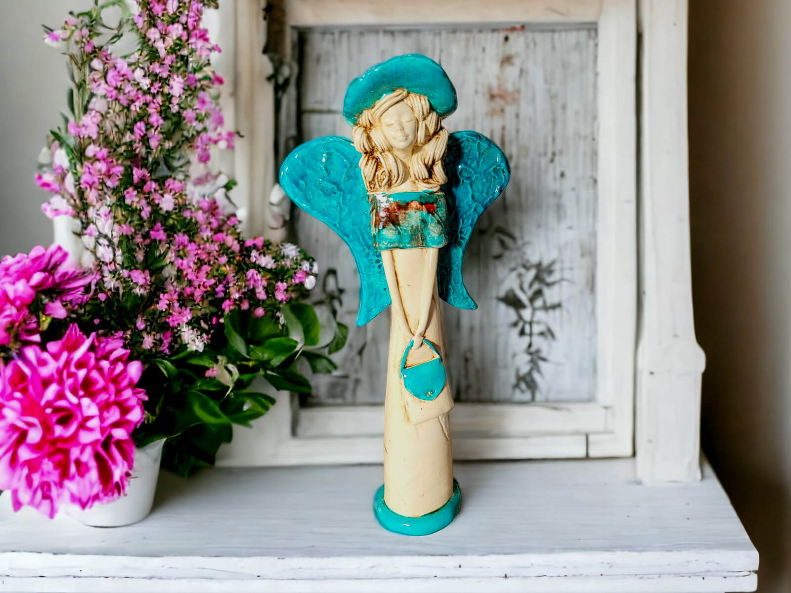 Anioł Olivia - turkus -  32 x 15 cm figurka dekoracyjna gipsowa