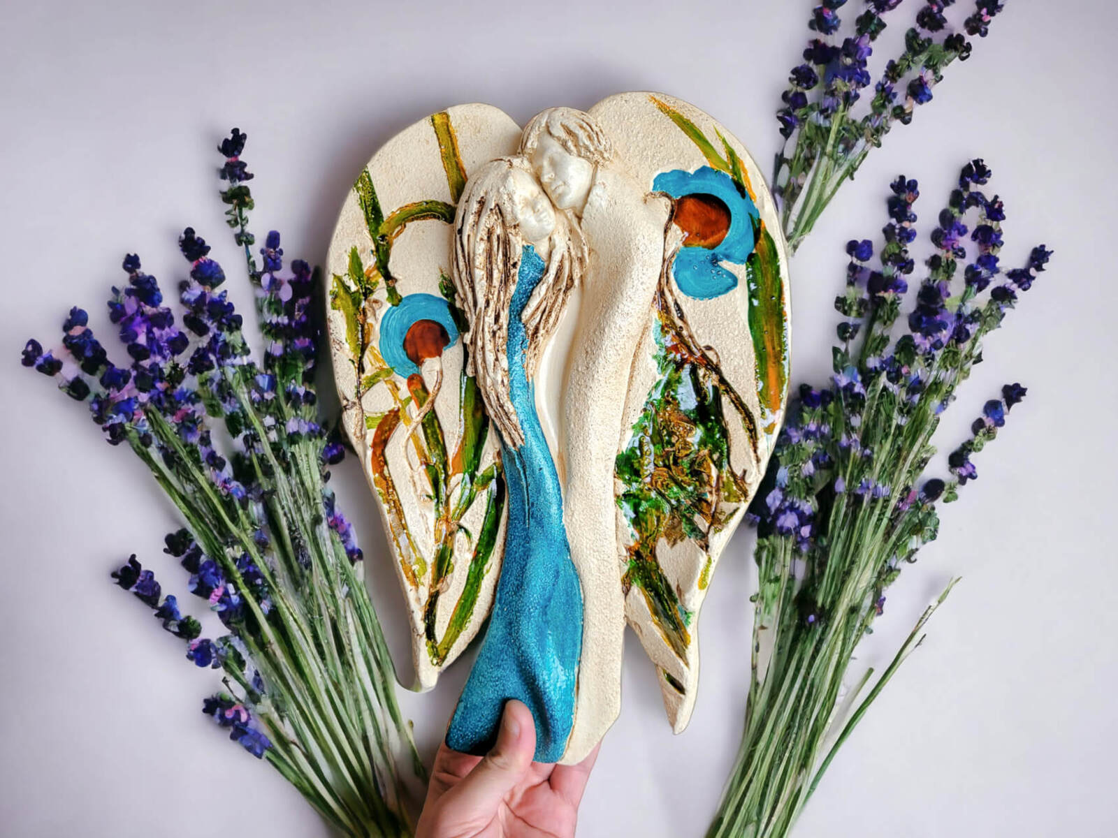 Kochające Anioły - wiszące turkus beż - 35 x 21 cm figurka dekoracyjna gipsowa