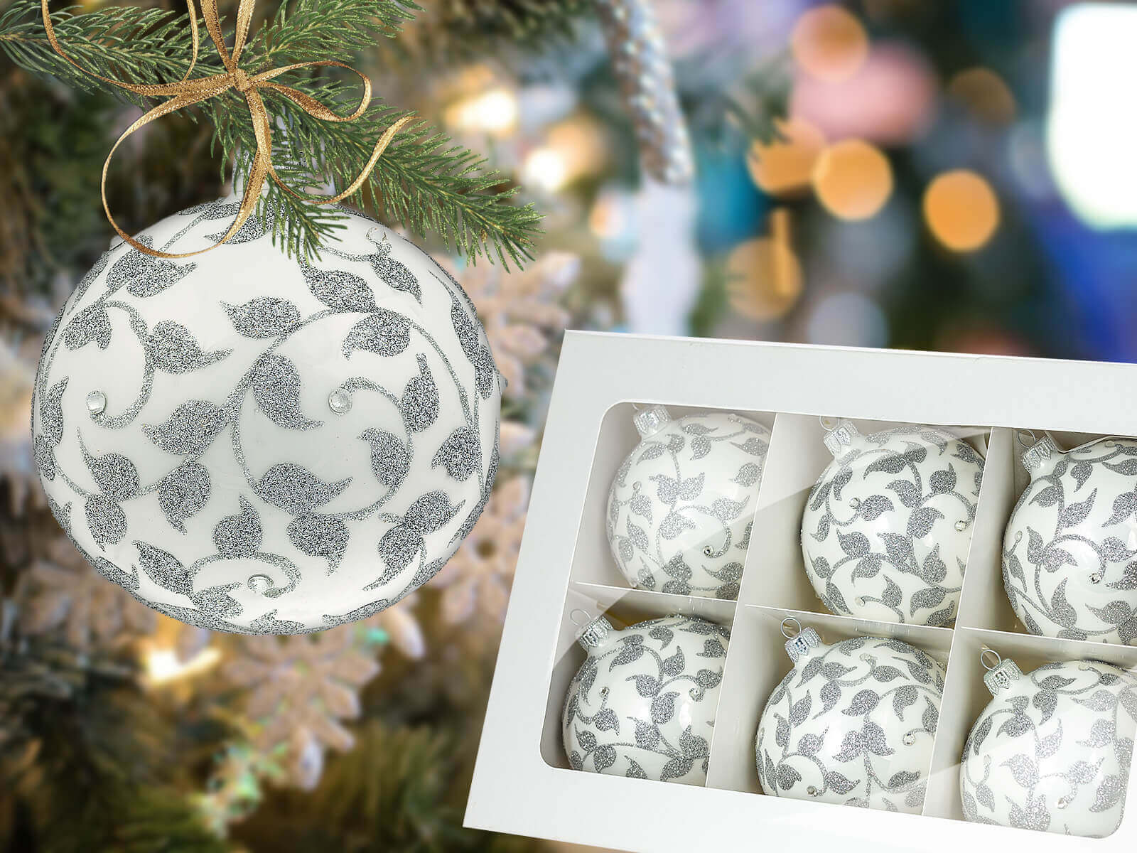 Bombki srebrne listki na białym opalu - 100 mm bombki choinkowe szklane 6 szt
