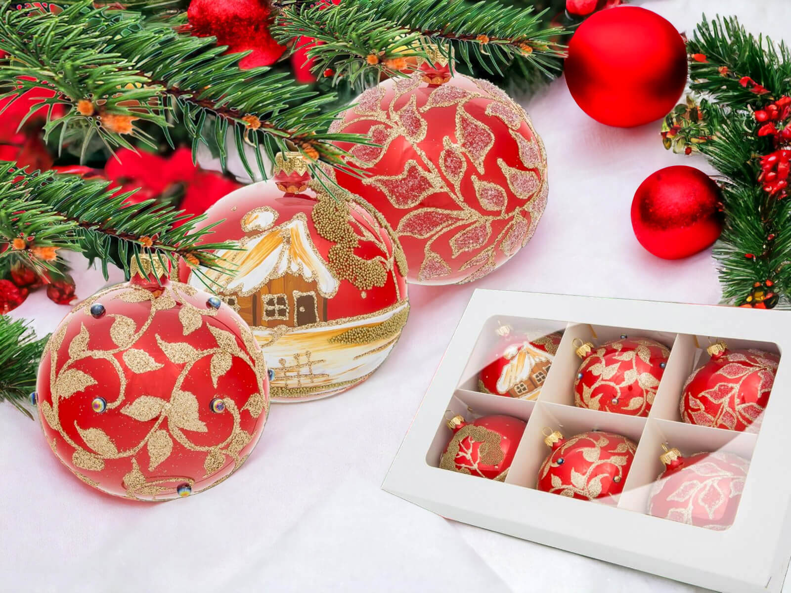 Bombki czerwony opal - złote listki z perełką chatki mrożone listki - 100 mm bombki choinkowe szklane