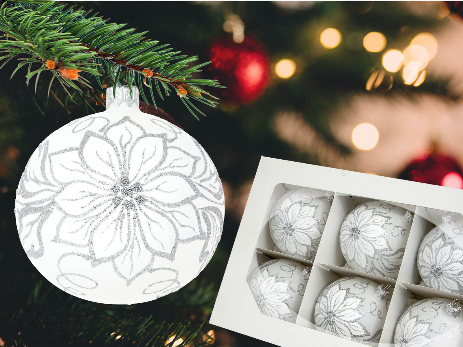 Bombki białe kwiaty na kredzie -  100 mm bombki choinkowe szklane 6 szt
