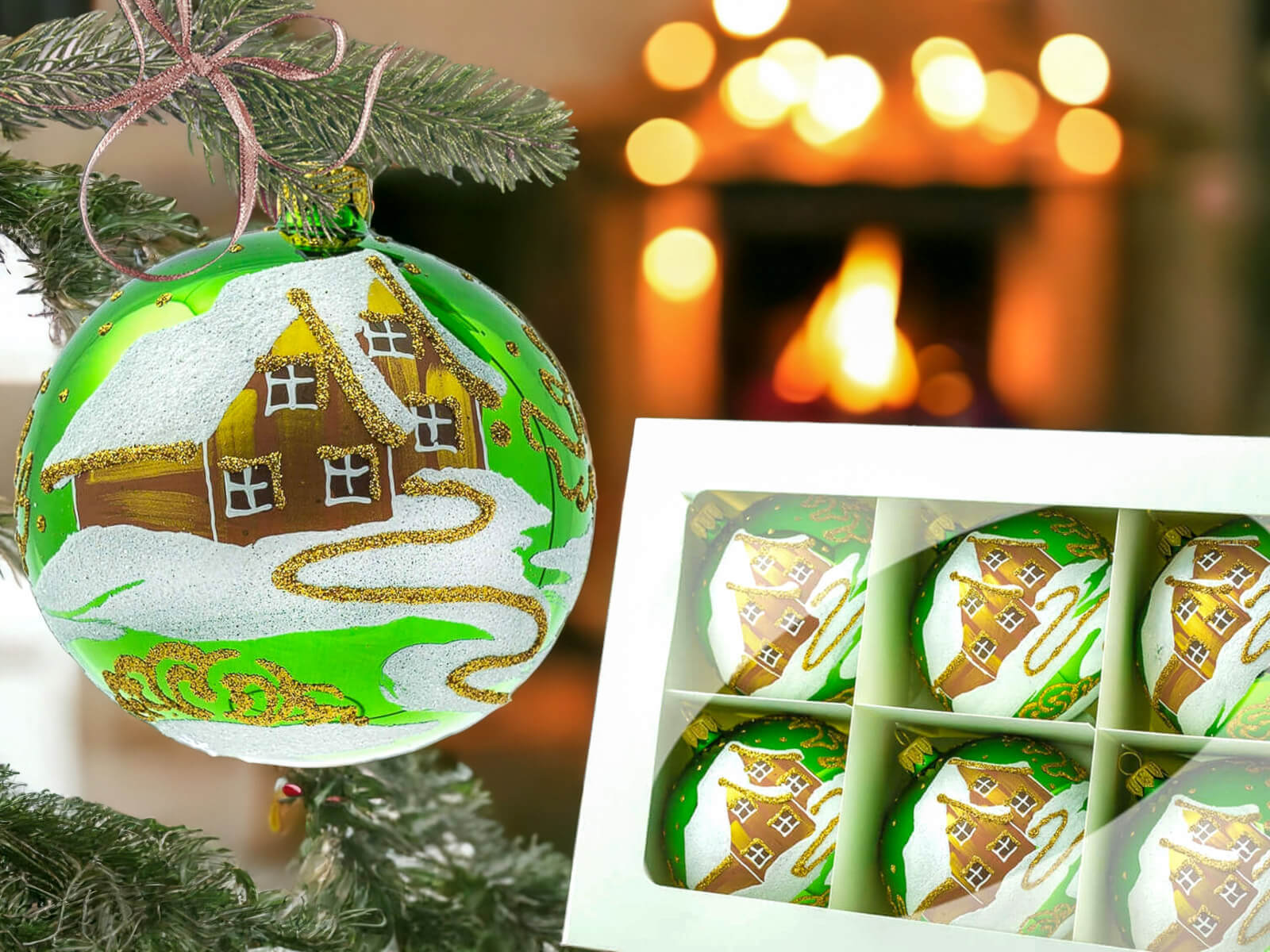 Złote chatki zielony błysku - 100 mm bombki choinkowe szklane 6 szt