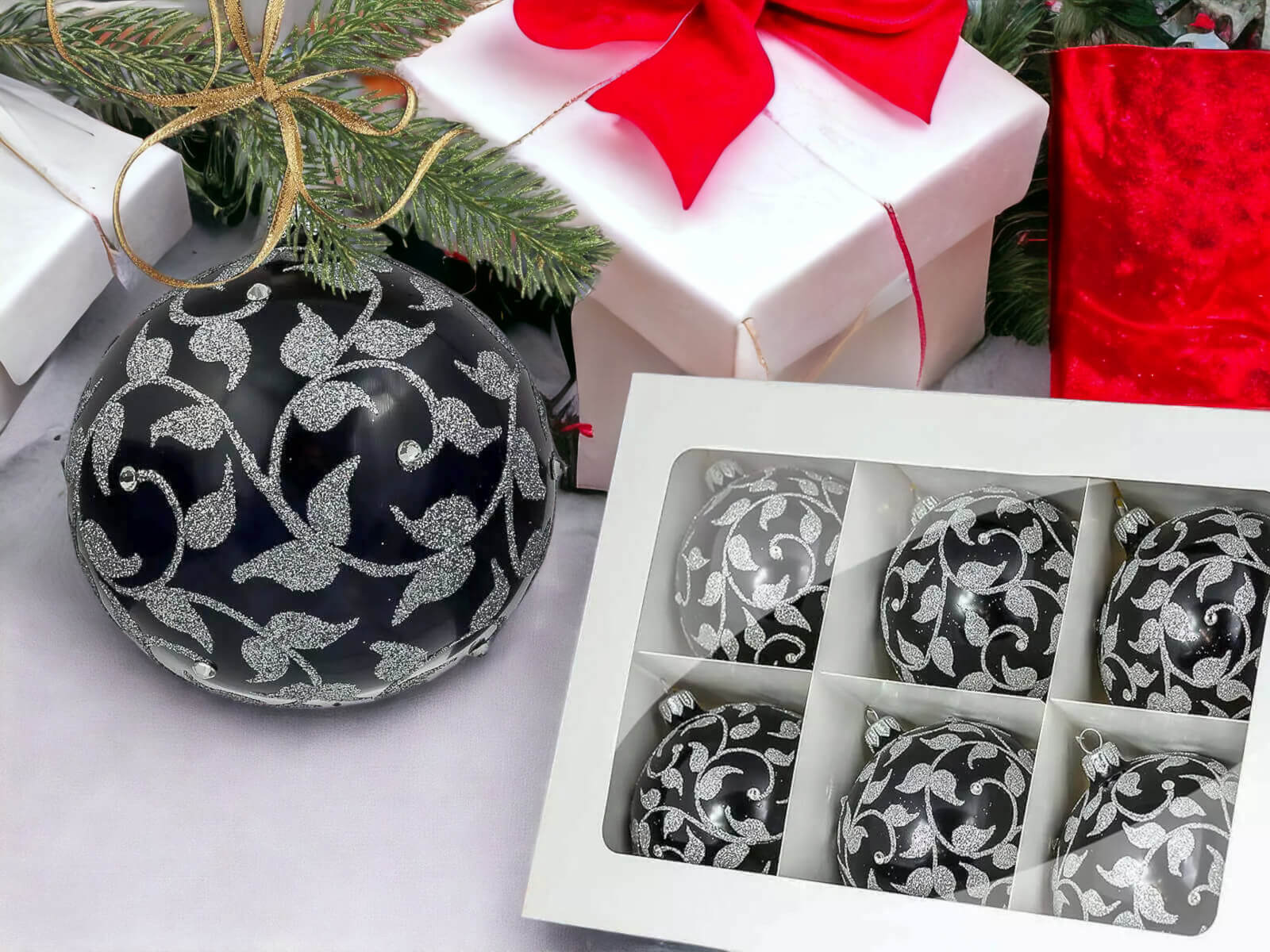 Bombki srebrne listki na czarnej porcelanie -  100 mm bombki choinkowe szklane 6 szt