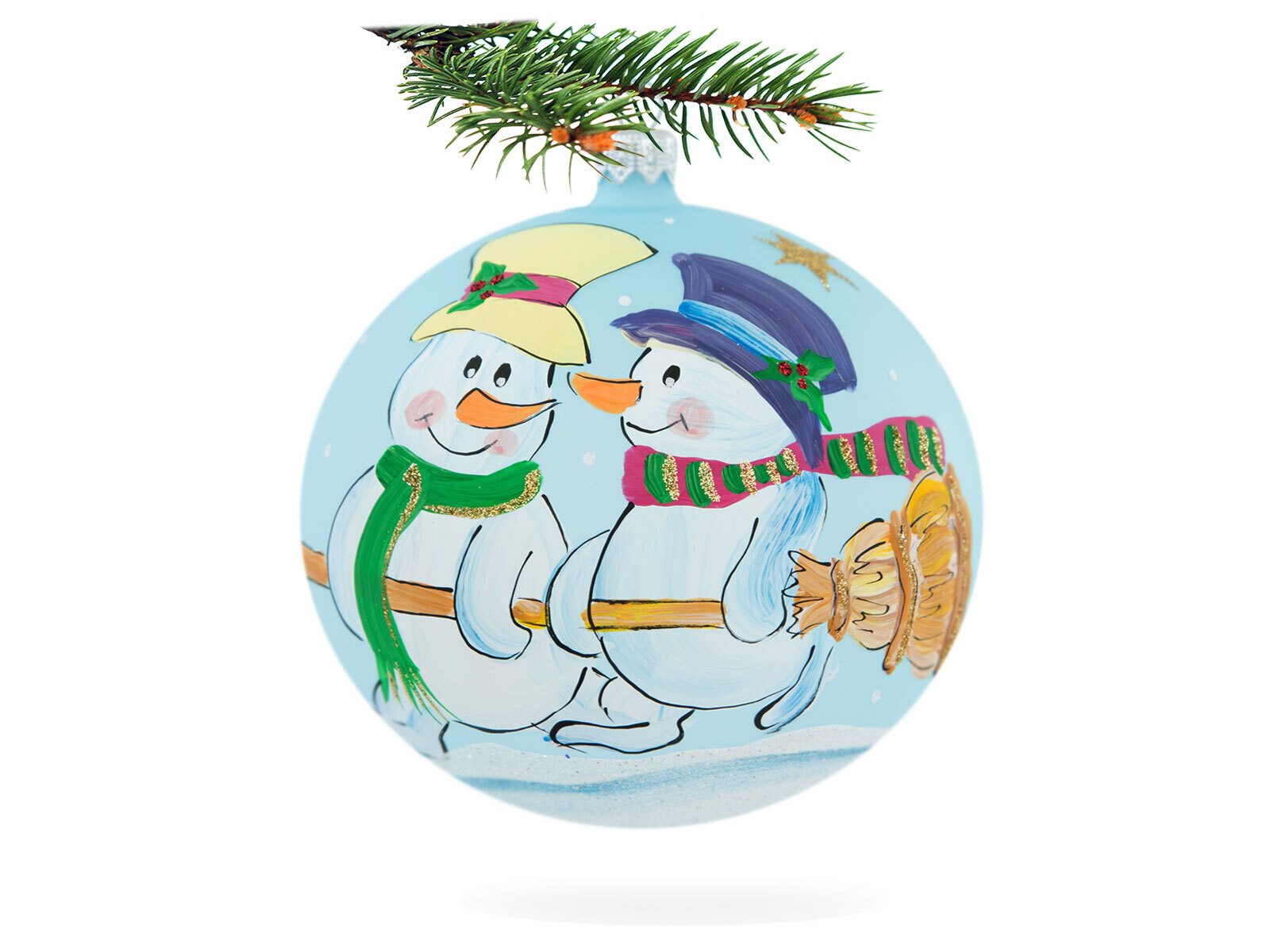Bałwanki z miotłą na niebieskim -  100 mm bombka choinkowa szklana 1 szt