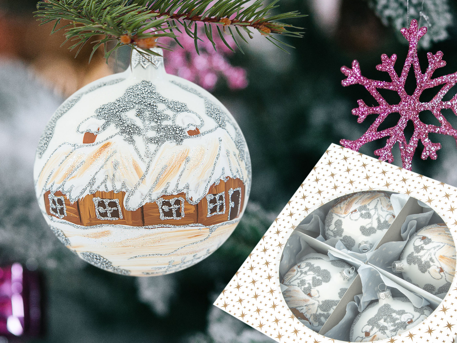 Bombki chatka i gwiazdka na kredzie - 100 mm bombka choinkowa szklana 4 szt