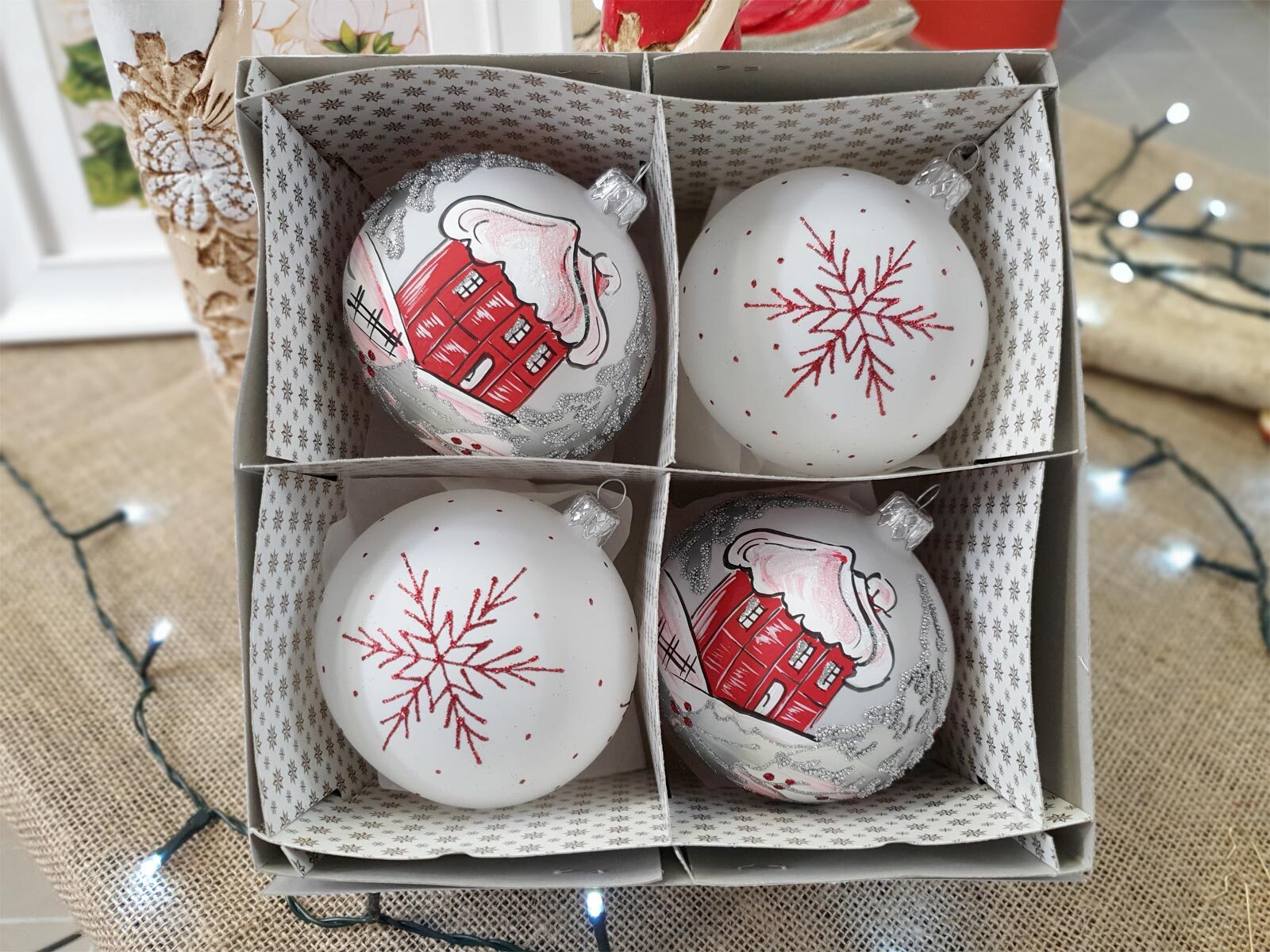 Bombki chatka i gwiazdka na kredzie -  100 mm bombka choinkowa szklana 4 szt